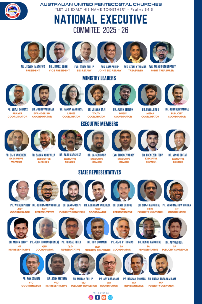 Australian United Pentecostal Churches (AUPC) is pleased to announce its National Executive Committee for 2025–2026. The appointed leadership team will guide the spiritual, administrative, and outreach efforts of AUPC Australia, working together to strengthen churches, equip youth leaders, and advance the AUPC mission across the nation.